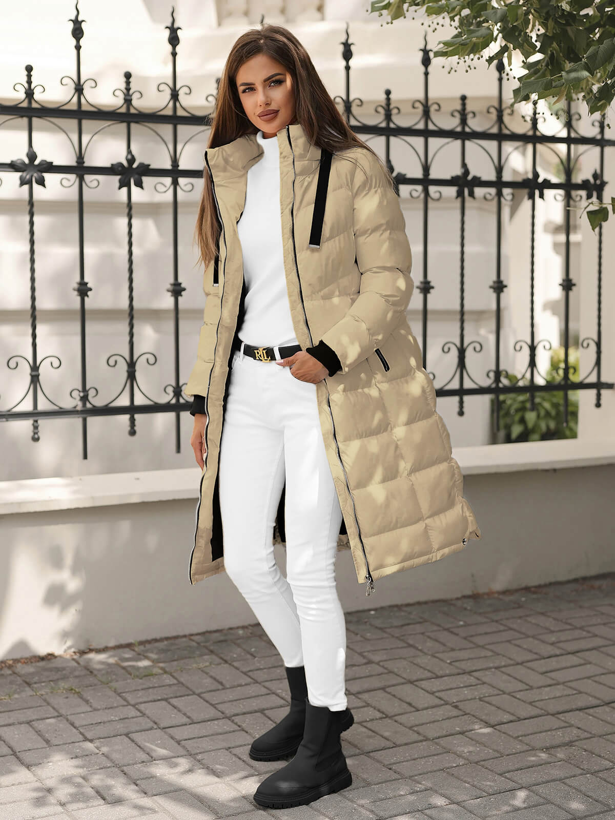 Modelka na zdjęciu ma 178 cm wzrostu i prezentuje kurtkę w rozmiarze M. Długa damska kurtka z najnowszej kolekcji to doskonały wybór dla kobiet, które cenią sobie zarówno styl, jak i komfort noszenia.