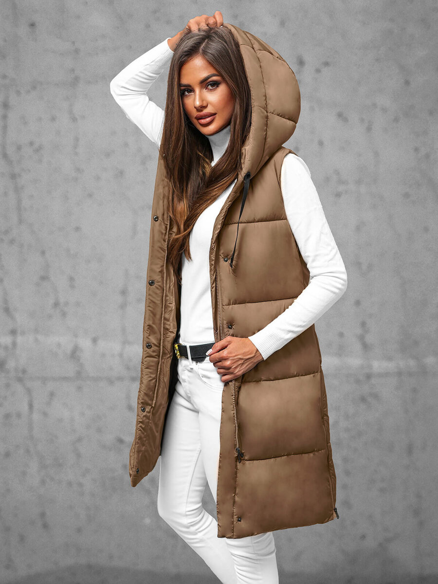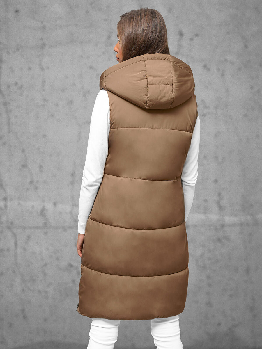 Kamizelka damska długa pikowana z kapturem ciemno-beżowa OZONEE JS/16M9093/62