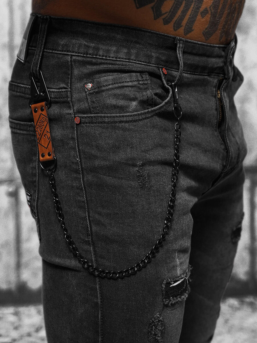 Fason slim fit, Ozdobne przetarcia, Odpinany ozdobny łańcuch, Kieszenie po bokach i z tyłu