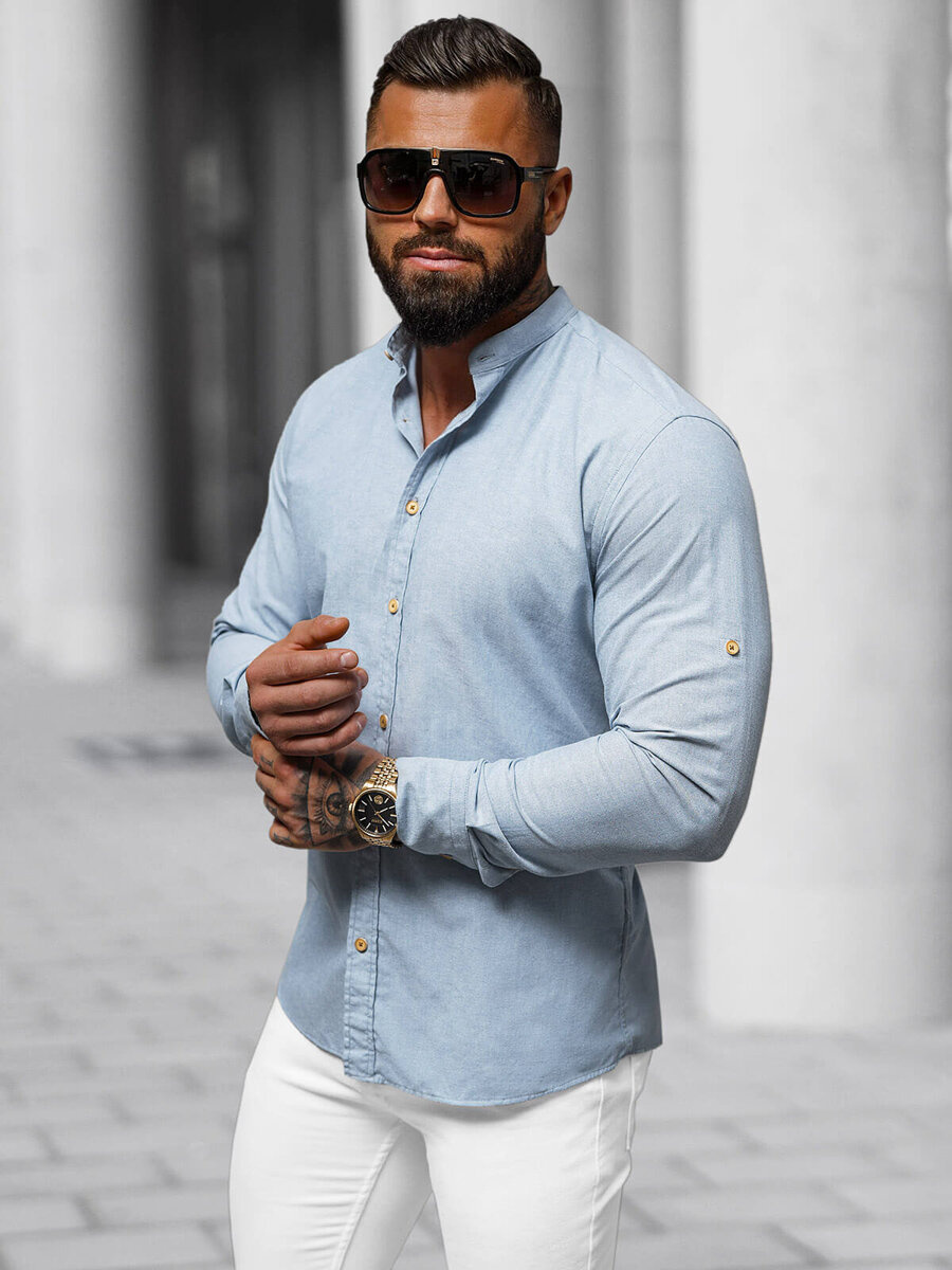 Prezentujemy Państwu koszulę męską jasno-niebieską OZONEE O/V89, która jest połączeniem klasycznego wzoru z najnowszymi trendami mody. Ten elegancki i stylowy element garderoby z pewnością zaspokoi oczekiwania najbardziej wymagających mężczyzn. Koszula zapinana jest na guziki, co dodaje jej elegancji i formalności. Długi rękaw oraz kołnierz typu stójka to cechy charakterystyczne tego modelu, które nadają mu unikalnego charakteru.