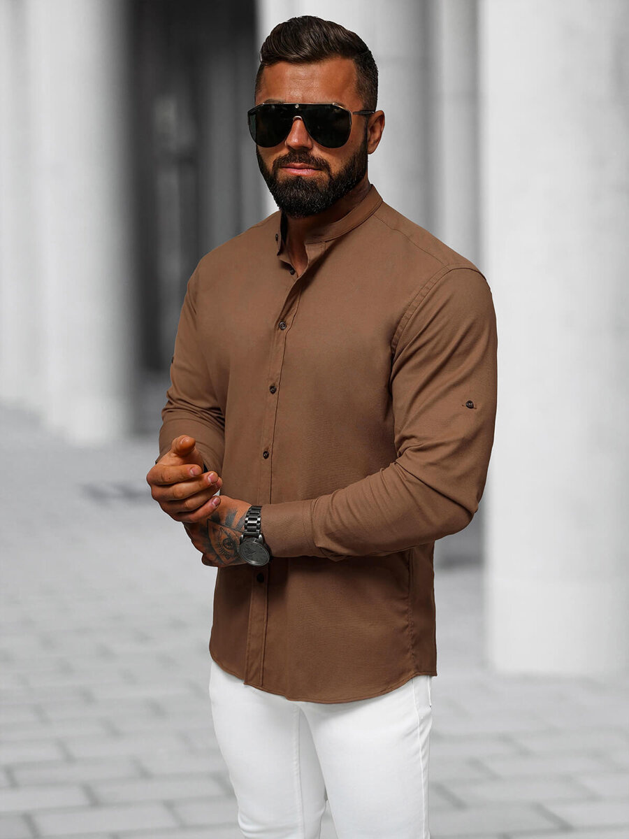 Prezentowana koszula męska brązowa OZONEE O/V104 to kwintesencja męskiego stylu i wyrafinowania. Wykonana z najwyższej jakości materiałów, oferuje niezrównany komfort noszenia, gwarantując przy tym doskonałe dopasowanie do sylwetki. Klasyka połączona z nowoczesnymi trendami tworzy unikalny wzór, który podkreśli Twój charakter i osobowość. Zapinana na guziki, z długim rękawem i kołnierzem typu stójka, ta koszula jest doskonałym wyborem na każdą okazję.