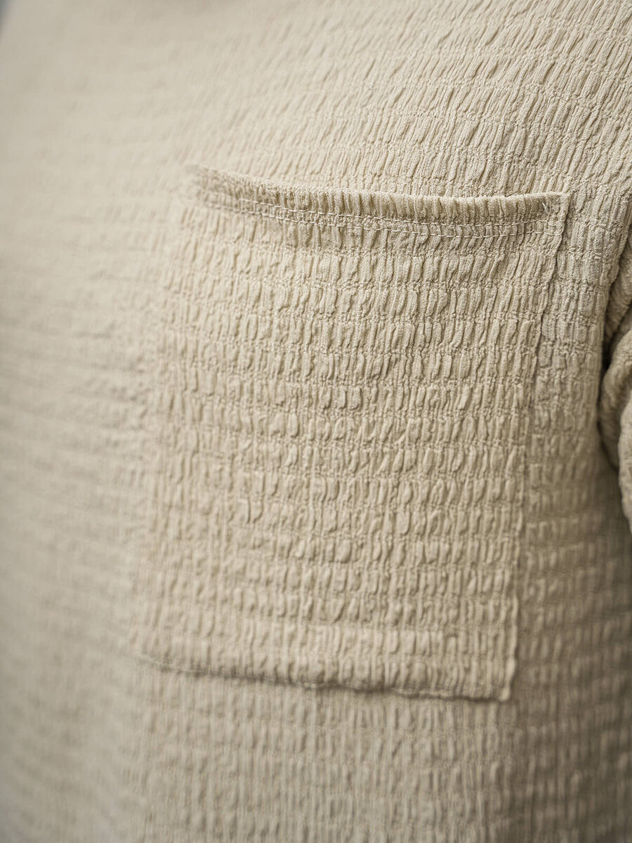 Podkreśl swoją męską elegancję z nową kolekcją basic T-shirtów męskich od OZONEE. Wykonany z najwyższej jakości dzianiny, ten beżowy T-shirt zapewnia nie tylko wyjątkowy komfort noszenia, ale także modny wygląd. Wyróżnia się unikalnym wypukłym wzorem, który dodaje mu niepowtarzalnego charakteru. Dodatkowo, koszulka jest wyposażona w praktyczną kieszeń z przodu, która dodaje jej funkcjonalności.