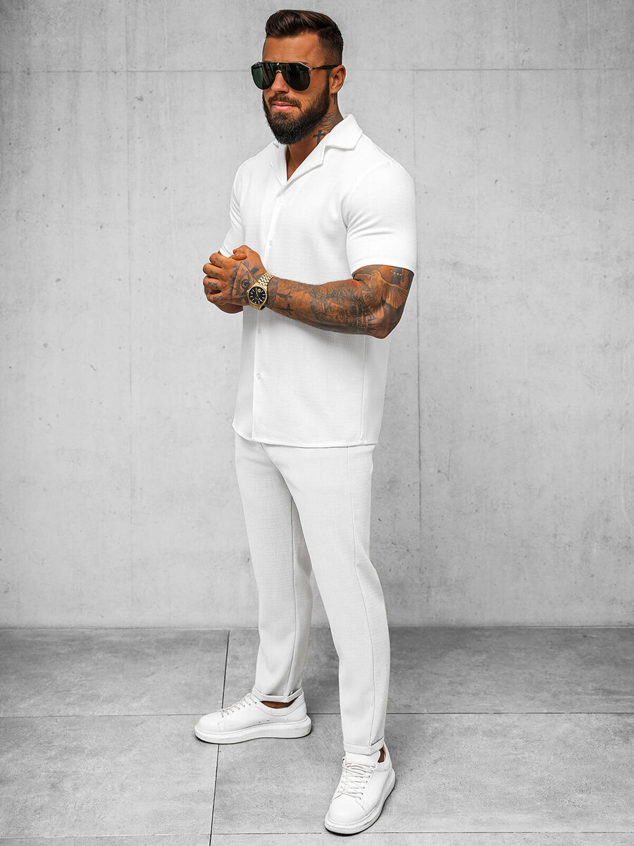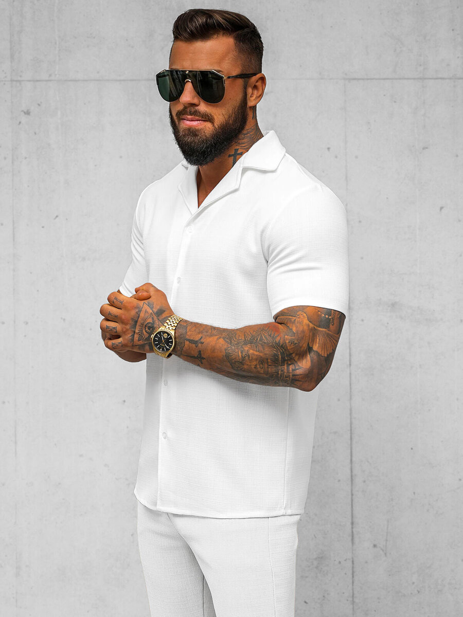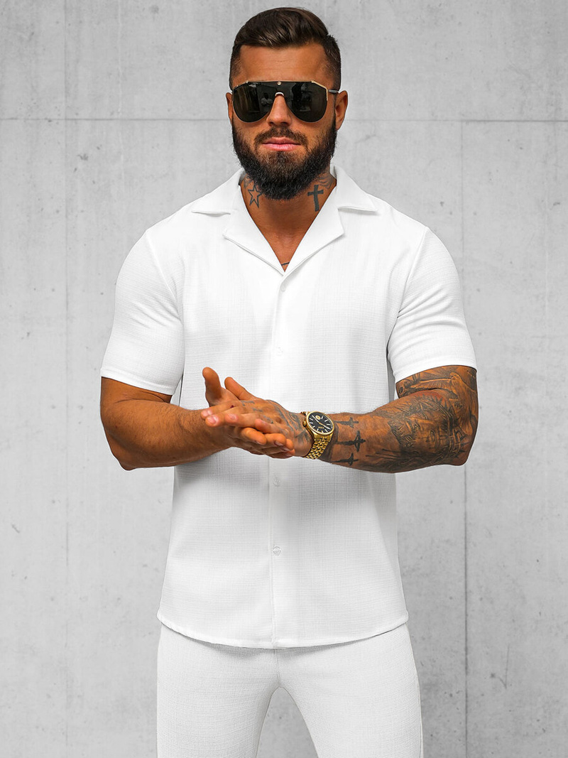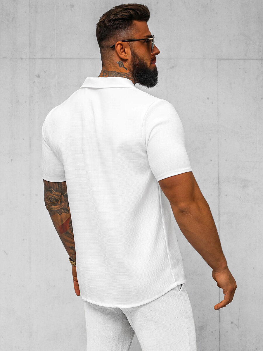 Koszula męska z krótkim rękawem biała OZONEE O/Y971T to idealna propozycja na różne okazje. Doskonale sprawdzi się zarówno na codziennych spacerach, jak i podczas spotkań ze znajomymi. Można ją łączyć z różnymi elementami garderoby, tworząc niezliczoną ilość stylizacji. Idealnie komponuje się z jeansami, szortami czy chinosami, tworząc modny i wygodny zestaw na każdą okazję.