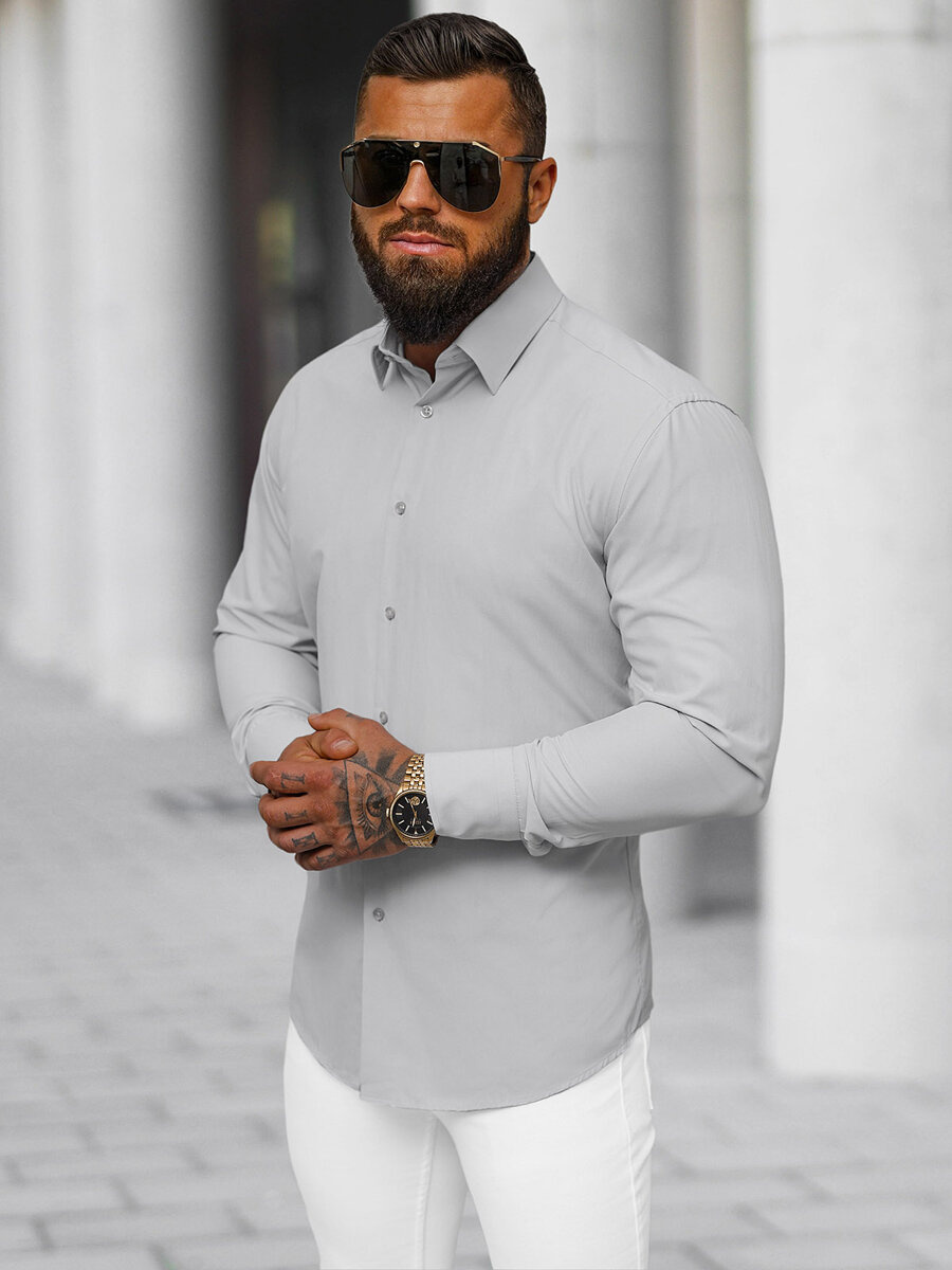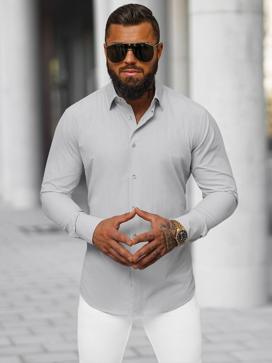 Koszula męska szara OZONEE O/V118 to kwintesencja stylu i wygody, idealna dla współczesnego mężczyzny. Wykonana z komfortowej dzianiny, gwarantuje doskonałe dopasowanie i swobodę ruchów. Charakterystyczne dla tego modelu są długie rękawy i klasyczny kołnierz typu kent, które nadają mu eleganckiego wyglądu. Zapinana na guziki, pozwala na łatwe i szybkie ubieranie.