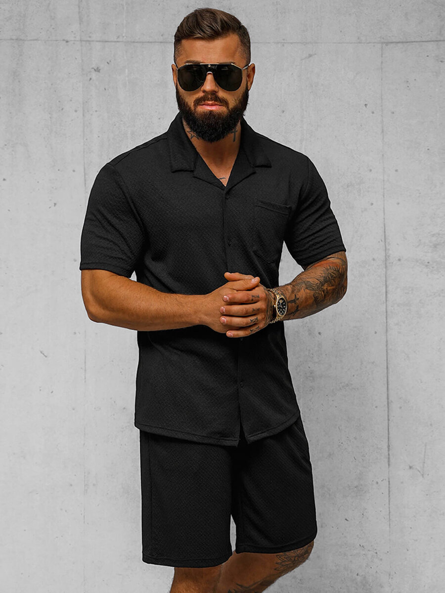 Nowoczesna elegancja w sportowym wydaniu - Komplet męski czarny - koszula i spodenki OZONEE O/3C323