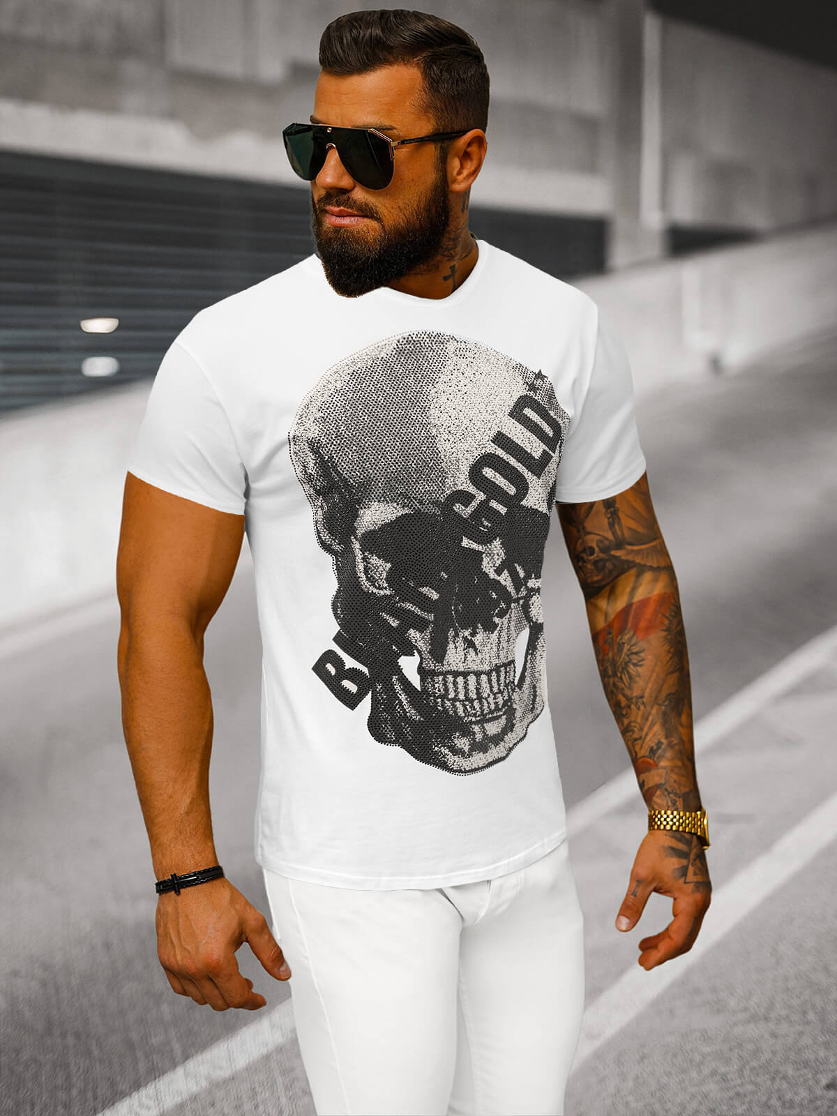 Koszulka pochodzi z naszej najnowszej kolekcji. Ma fason typu slim fit, czyli przylegający do ciała oraz dekolt typu U-neck. Na środku t-shirtu znajduje się duży nadruk z motywem czaszki ozdobiony połyskującymi cyrkoniami. Koszulka została wyprodukowana z bawełny z domieszką elastanu, co sprawia, że jest wygodna w noszeniu, przyjemna w dotyku, ładnie dopasowuje się do sylwetki i nie gniecie się.