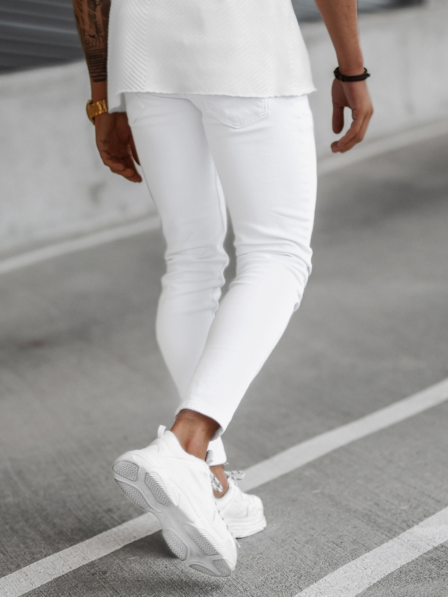 Białe jeansy to niezbędnik w wiosenno — letniej garderobie każdego mężczyzny. Z ich pomocą można stworzyć wiele modnych stylizacji na ciepłe dni. Spodnie będą się świetnie komponowały z męskimi ubraniami dostępnymi w asortymencie naszego sklepu internetowego, takimi jak t — shirty, tanktopy czy longsleevy. Białe jeansy z wąskimi nogawkami nadają się na różne okazje — spotkanie ze znajomymi, imprezę, koncert czy randkę.
