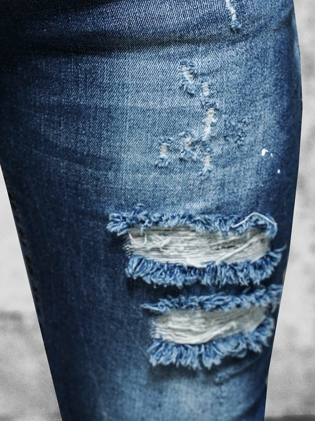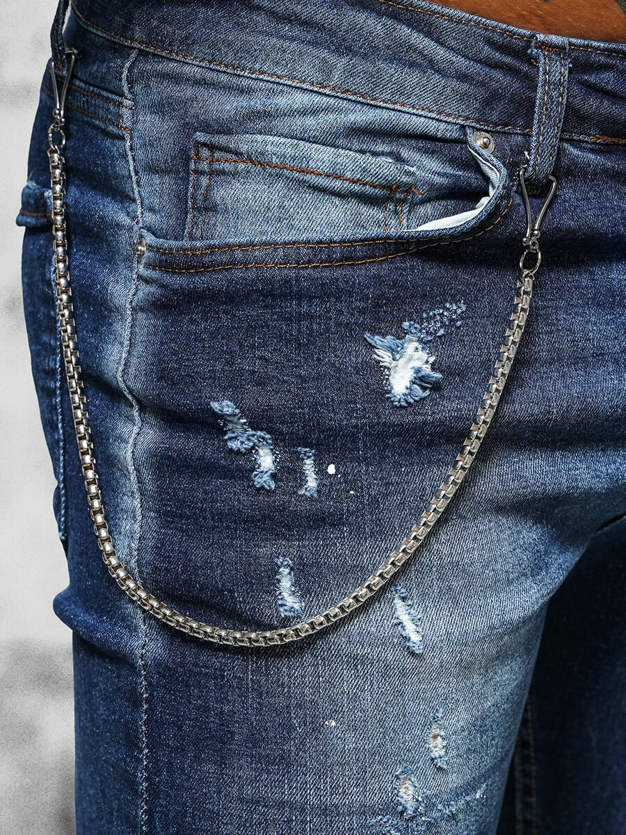 Te męskie jeansy typu slim fit to połączenie wygody i modnego designu. Dopasowują się do sylwetki, podkreślając jej atuty, a jednocześnie zapewniają swobodę ruchów. Modne przetarcia dodają im charakteru, a ozdobny, odpinany łańcuch to detal, który przyciąga wzrok. Kieszenie z przodu i z tyłu są nie tylko praktyczne, ale także stanowią element dekoracyjny.