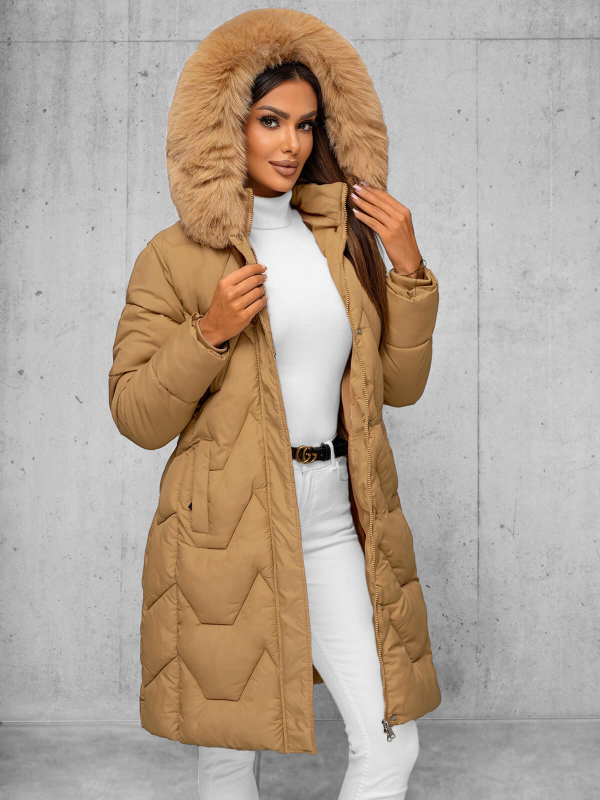 Elegancja i funkcjonalność w zimowym wydaniu: Kurtka zimowa damska długa z futerkiem beżowa OZONEE JS/16M9202/62Z