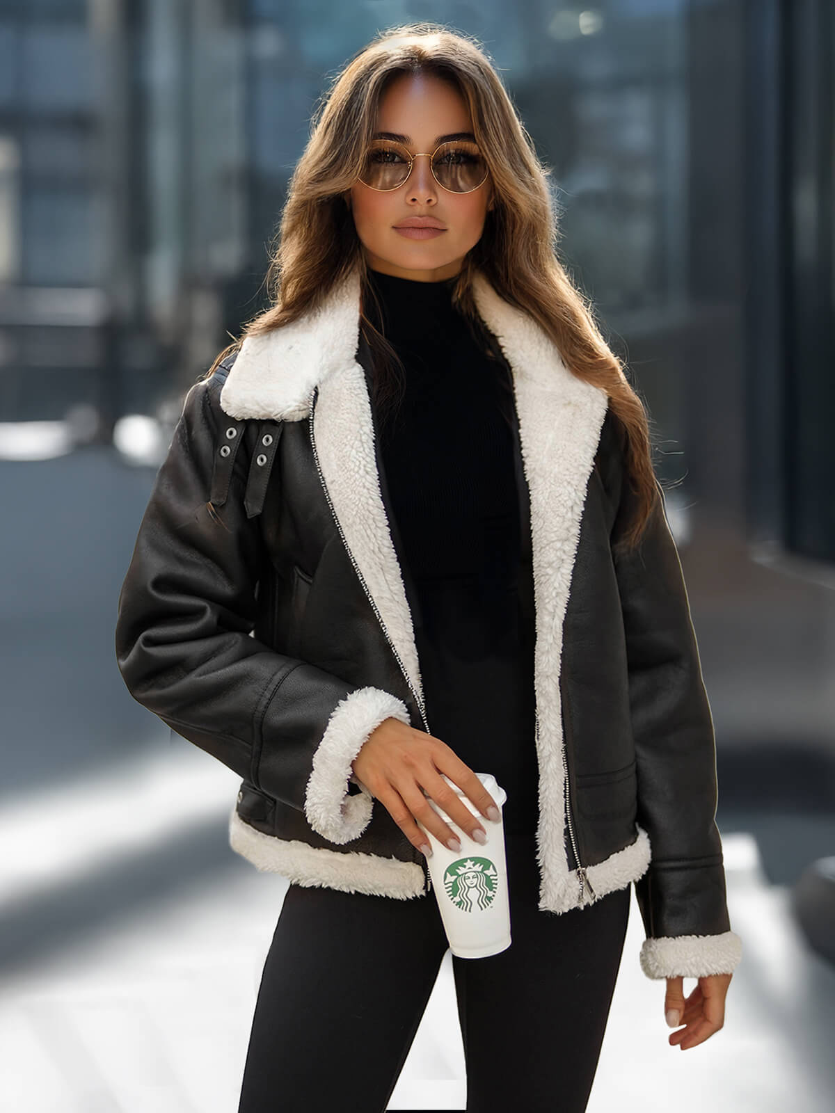 Ta kurtka to kwintesencja nowoczesnej elegancji połączonej z niezrównanym komfortem. Wykonana z materiału imitującego skórę, oferuje luksusowy wygląd bez kompromisów na wygodzie. Ocieplenie z kożucha zapewnia ciepło w chłodniejsze dni, a klasyczny kołnierz dodaje wyrafinowanego stylu. Kieszenie po bokach nie tylko podkreślają praktyczność, ale również dodają uroku tej wyjątkowej kurtce.