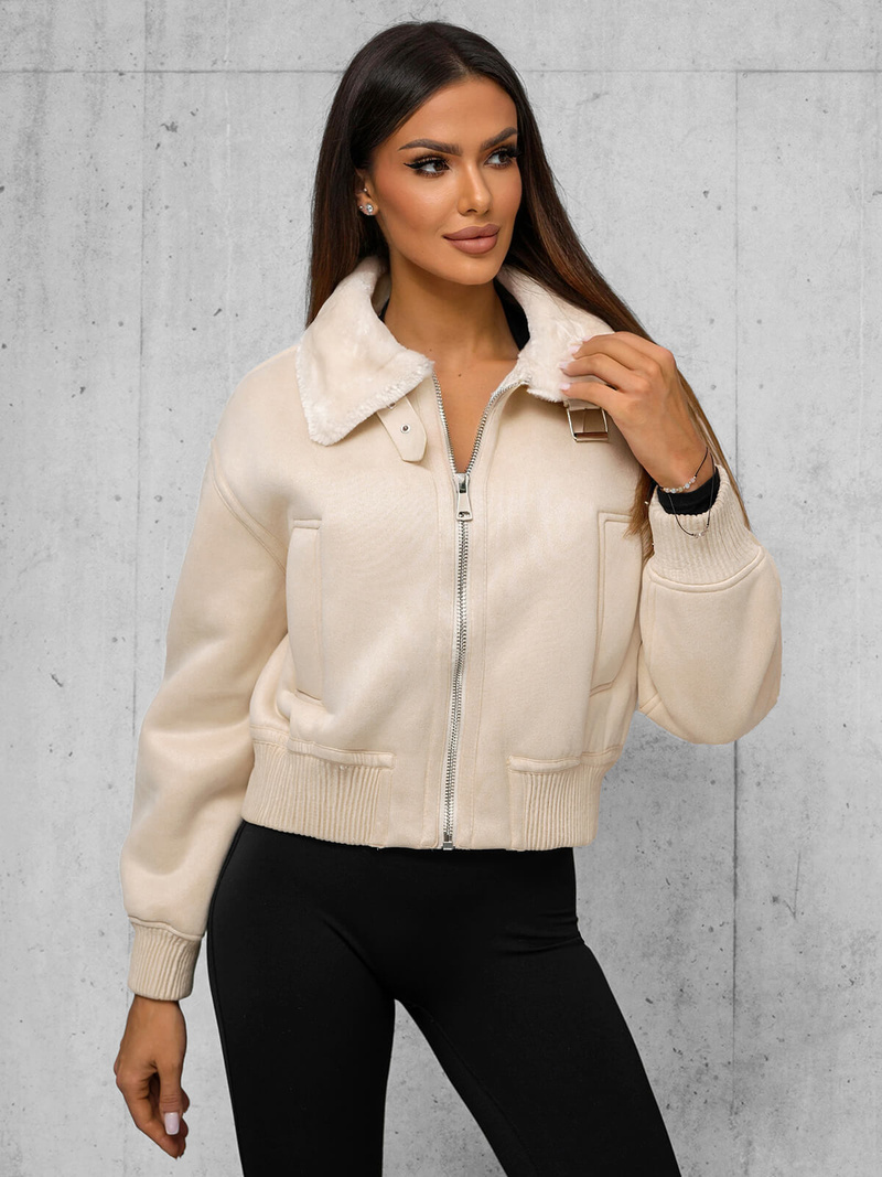 Elegancja i ciepło w jednym - Kurtka damska z futerkiem ecru OZONEE O/81326Z