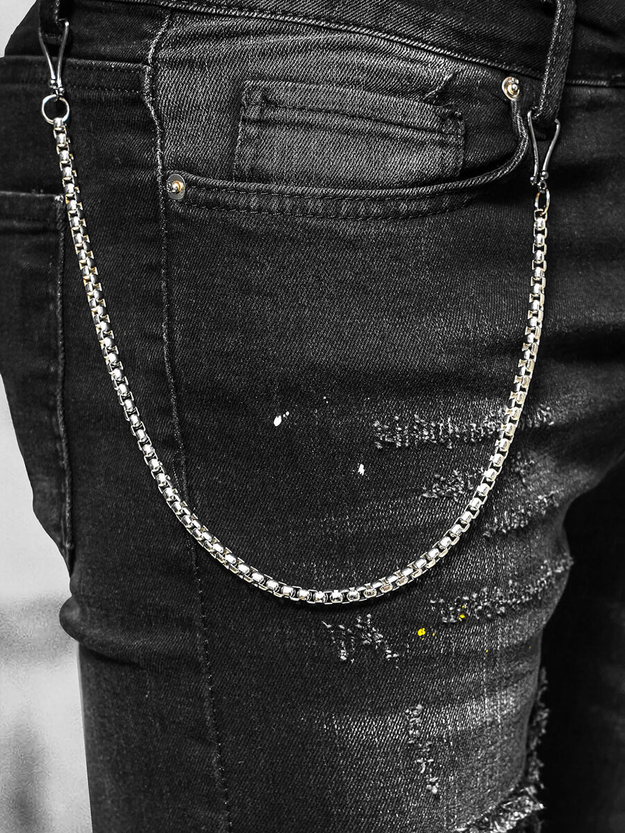 Te męskie jeansy typu slim fit to połączenie wygody i modnego designu. Dopasowują się do sylwetki, podkreślając jej atuty, a jednocześnie zapewniają swobodę ruchów. Modne przetarcia dodają im charakteru, a ozdobny, odpinany łańcuch to detal, który zwraca uwagę. Kieszenie z przodu i z tyłu są nie tylko praktyczne, ale także stanowią element dekoracyjny.