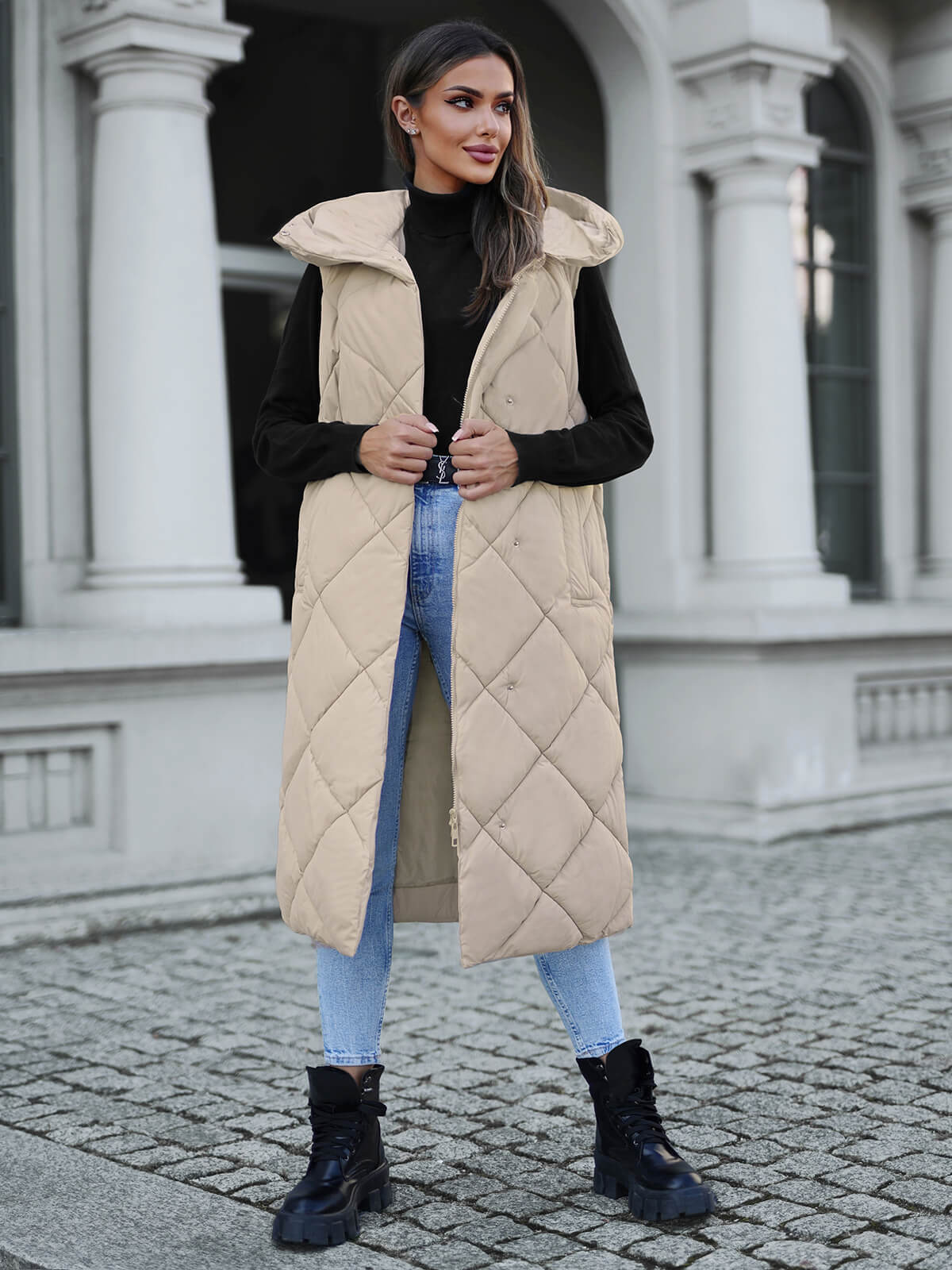 Kamizelka damska długa pikowana beżowa OZONEE JS/5M3165/62Z