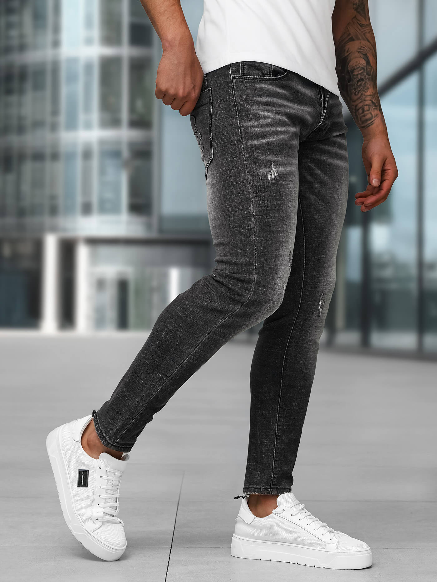 Typ slim fit, modne przetarcia na nogawkach, kieszenie po bokach, kieszenie z tyłu.
