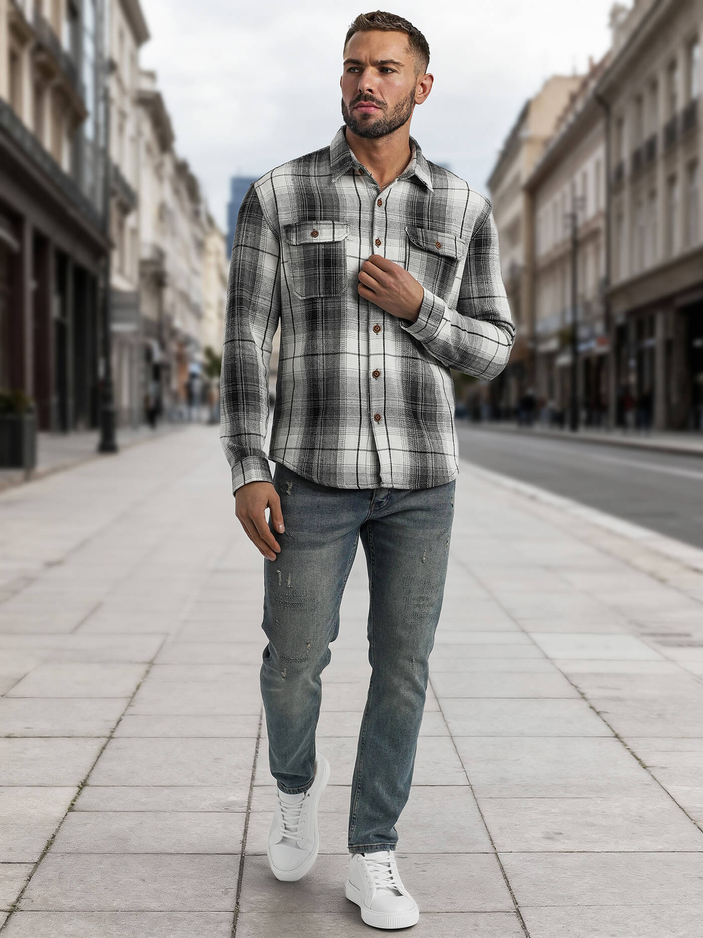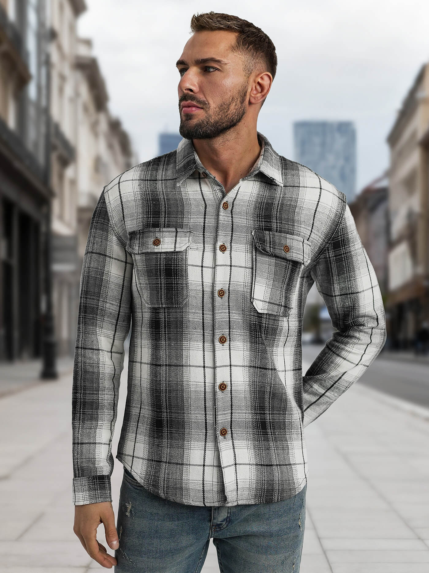 Koszula flanelowa męska w kratę czarno-biała OZONEE NB/MC728N/4