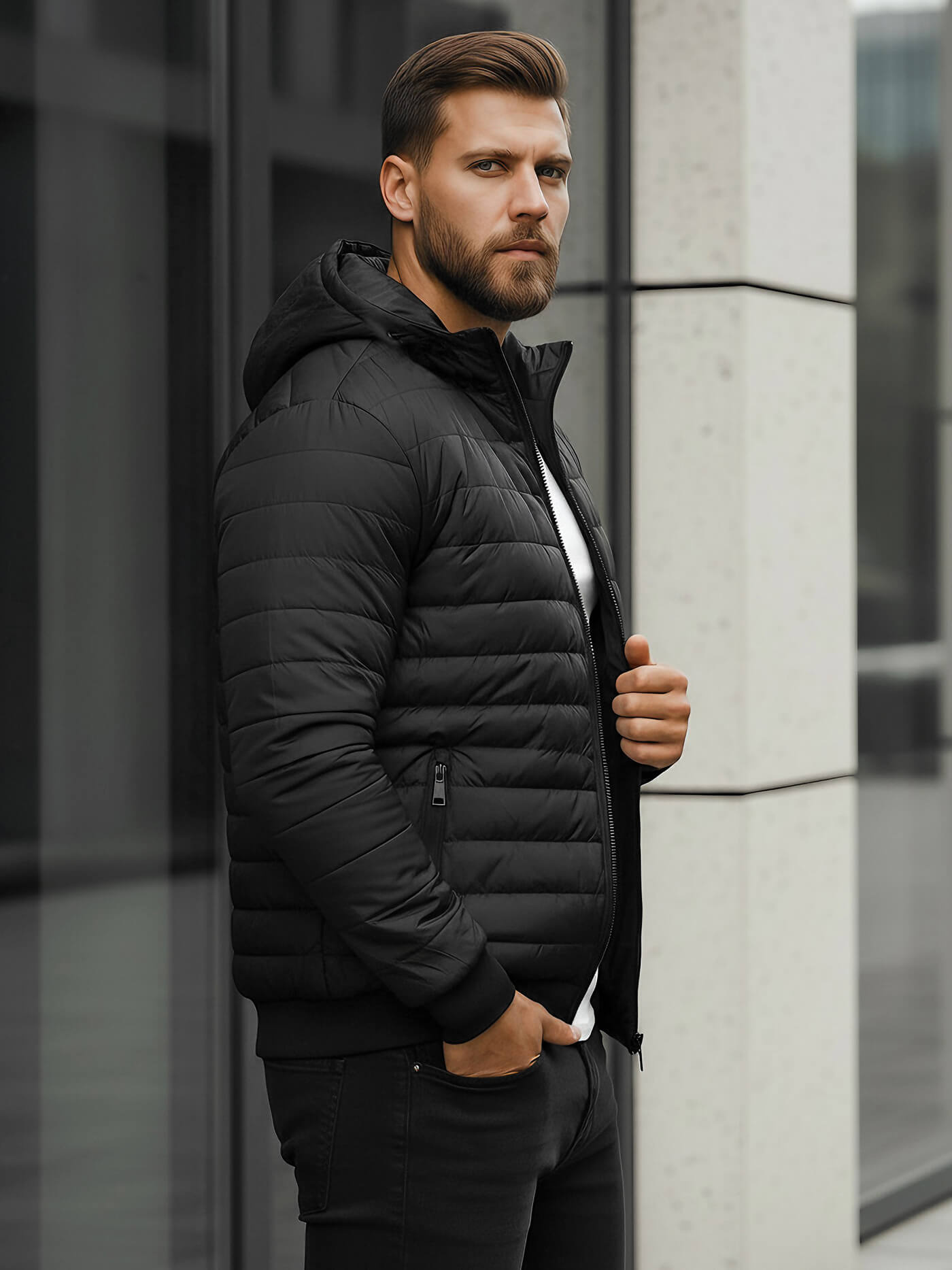 Kurtka męska marki Ozonee to przejściowa kurtka typu bomber o dopasowanym kroju, wykonana z poliestru, przeznaczona do noszenia w sezonie wiosennym i jesiennym. Model posiada regulowany kaptur ze ściągaczem, klasyczne pikowania oraz elastyczne wykończenia przy dole i rękawach, które sprzyjają stabilnemu dopasowaniu. Funkcjonalność uzupełniają boczne kieszenie oraz kieszonka na rękawie, wszystkie zapinane na zamek.