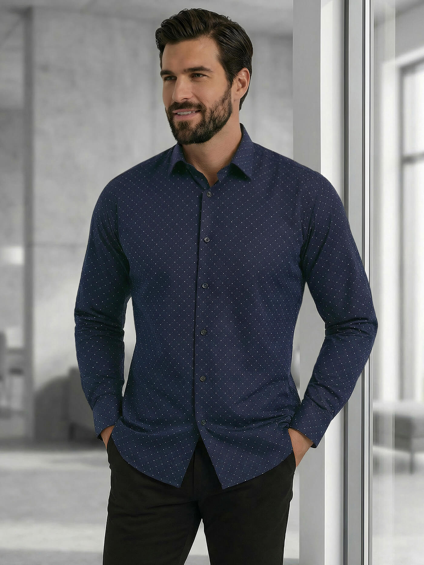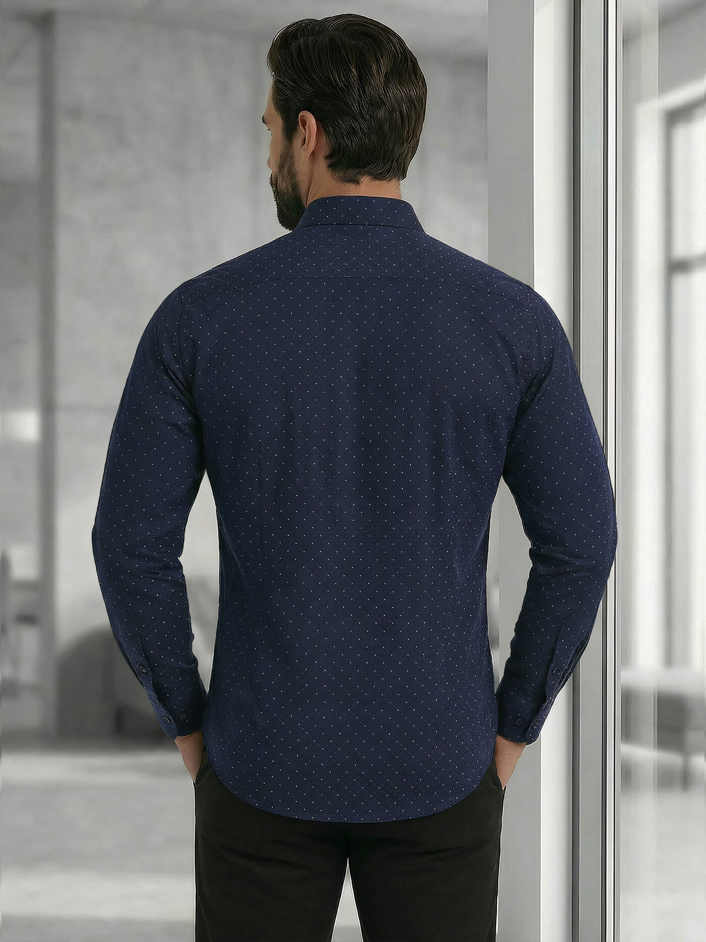Granatowy kolor nadaje koszuli klasyczny, stonowany charakter, który dobrze sprawdza się w zestawieniach z marynarką, spodniami materiałowymi lub chinosami. Model wpisuje się w estetykę eleganckiej odzieży codziennej oraz stylizacji okazjonalnych.