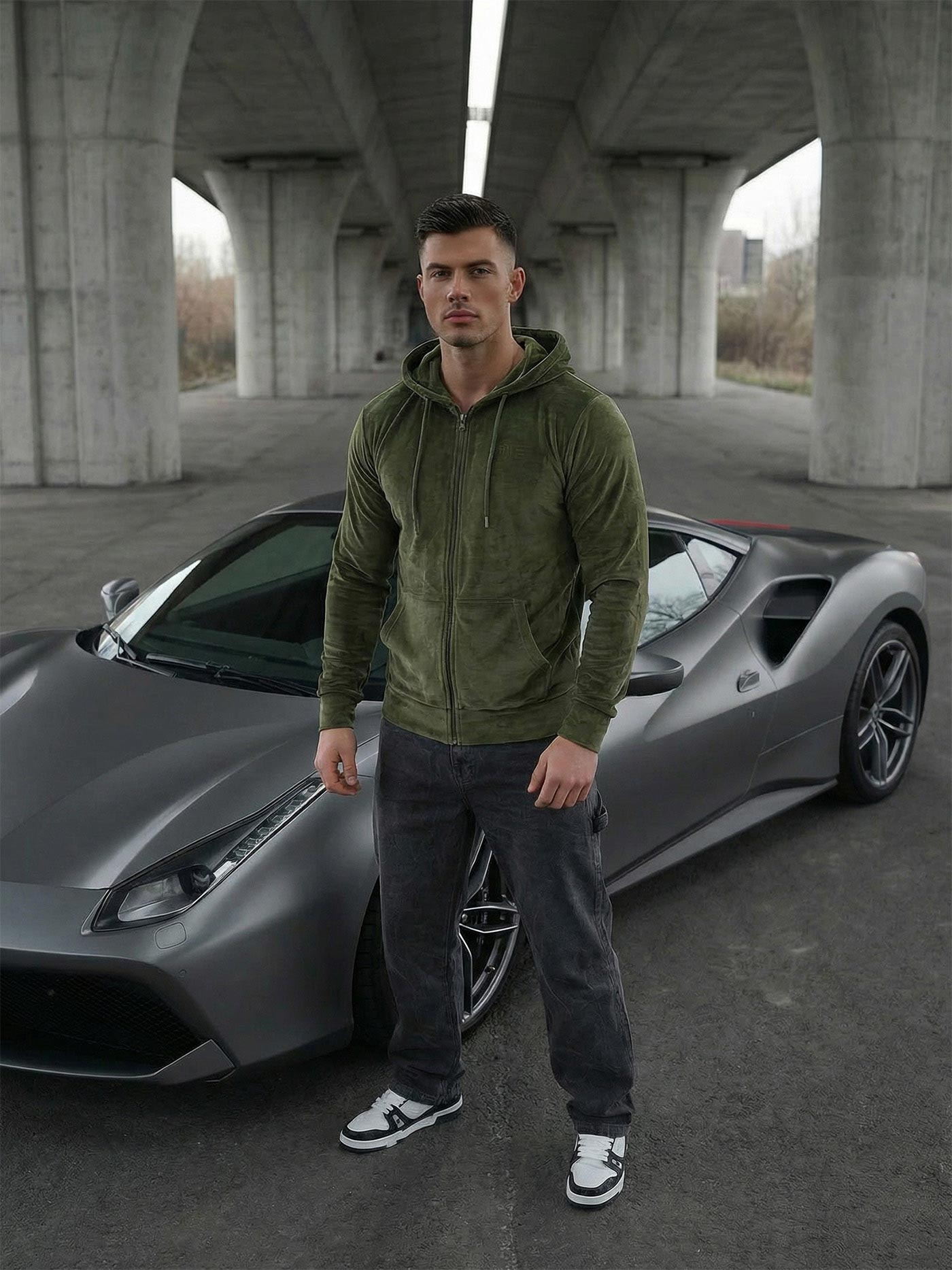 Bluza welurowa męska z kapturem khaki OZONEE JS/8B1168/29Z to połączenie wygody i nowoczesnego designu. Wykonana z najwyższej jakości materiałów, zapewnia komfort noszenia przez cały dzień. Zapinana na zamek, posiada kaptur, który dodaje jej niepowtarzalnego charakteru. Dół i rękawy wykończone ściągaczem podkreślają jej sportowy styl.