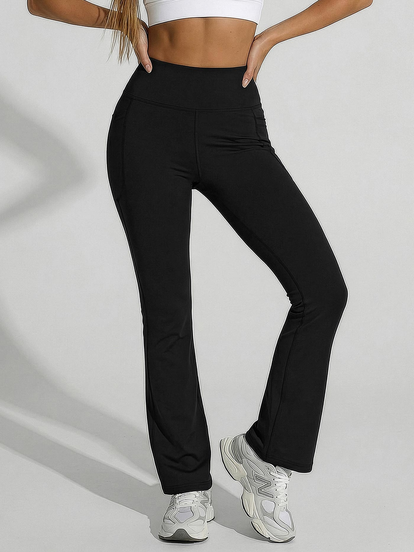 Wysoki stan z elastycznym pasem pomaga utrzymać legginsy we właściwej pozycji podczas ruchu. Krój typu dzwony zapewnia swobodę w dolnej części nogawek, co wpływa na komfort noszenia przy aktywnościach wymagających większej mobilności.